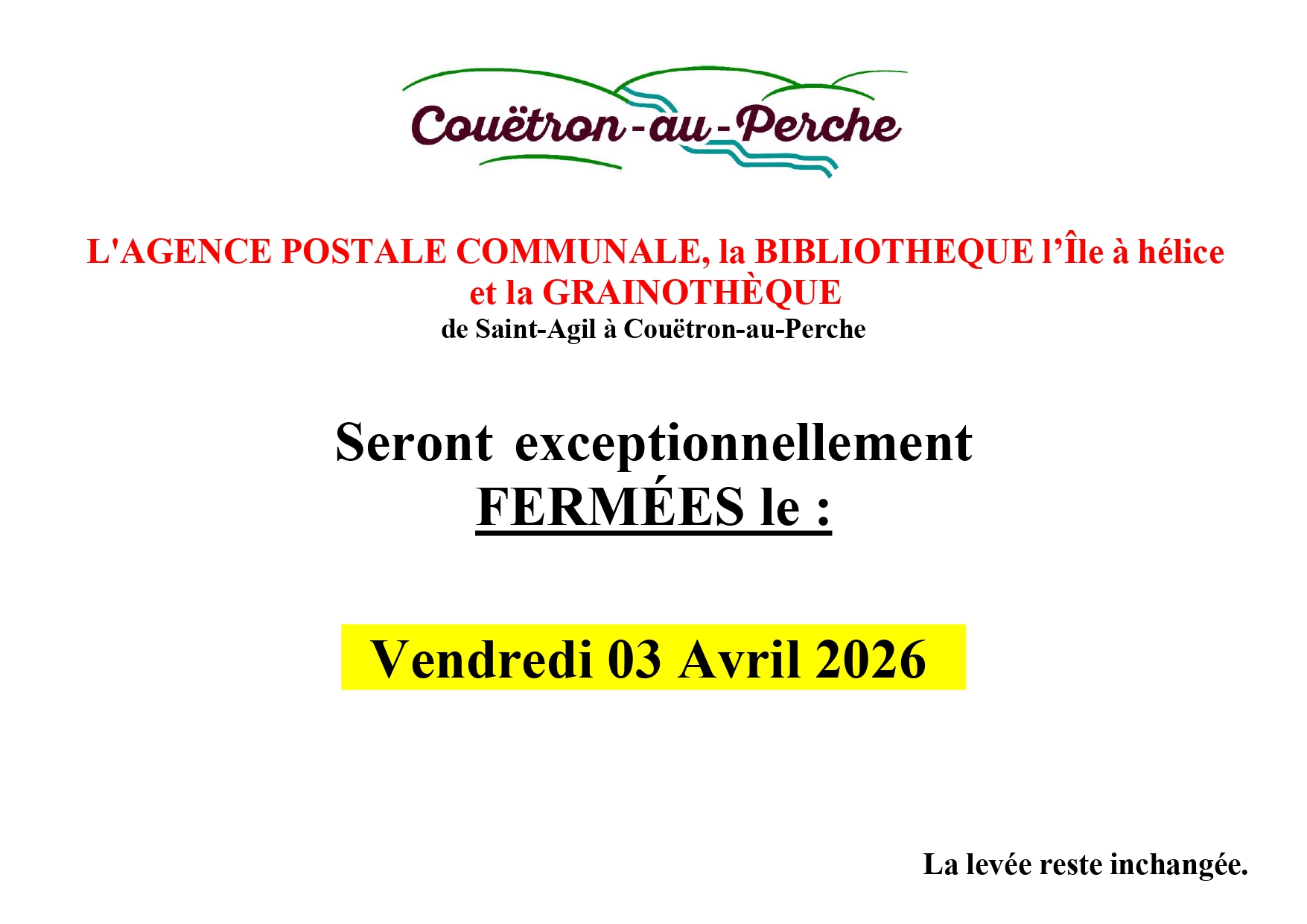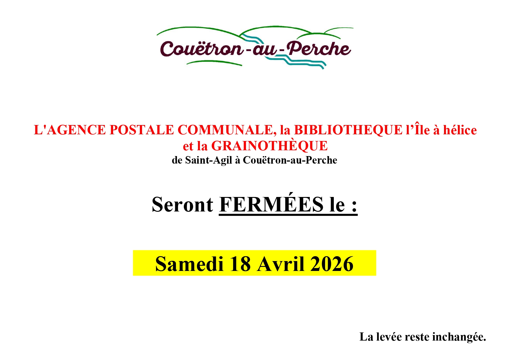 SAINT-AGIL : Mardi de 14h à 18h et Vendredi de 8h30 à 12h